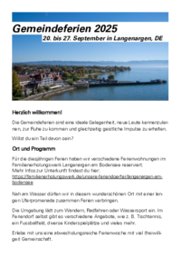 Gemeindeferien 2025 20. bis 27. September in Langenargen, DE Herzlich willkommen! Die Gemeindeferien sind eine ideale Gelegenheit, neue Leute kennenzulernen, zur Ruhe zu kommen und gleichzeitig…