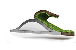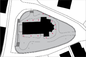 Ringsum die Kirche wurden zwölf Sockelleuchten positioniert. Diese sind in den Rasen eingebettet, so dass nur ein kleiner Hügel sichtbar bleibt. Die Wärme des Lichts wird mit Filtern angepasst auf den gewünschten Verlauf, oben heller und unten dunkler.