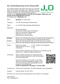 Ski- und Snowboard-Tag vom 28. Februar 2026 Es ist wieder soweit! Auch dieses Jahr wollen wir zusammen einen Tag im Schnee verbringen. Dazu eingeladen sind alle Kinder im Schulalter. Wir sind…