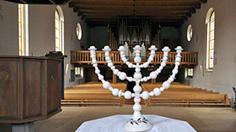 Auf dem Taufstein steht als Zeichen unserer Verbundenheit mit Israel eine Menora, (Siebenarmiger Leuchter) aus Ton getöpfert von Traudi Däpp.